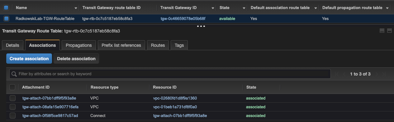 Check the TGW route table if all attachments created in steps 2-5 have been associated successfully. If not, associate missing attachments.