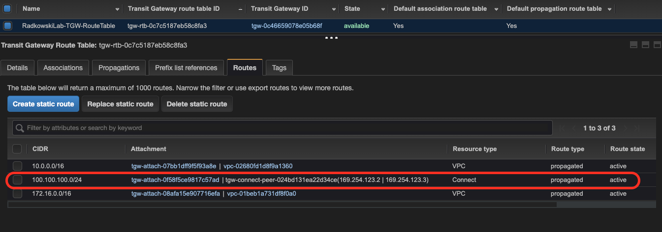Using AWS Console check if route 100.100.100/0 added in step #17 has been properly propagated in TGW route table